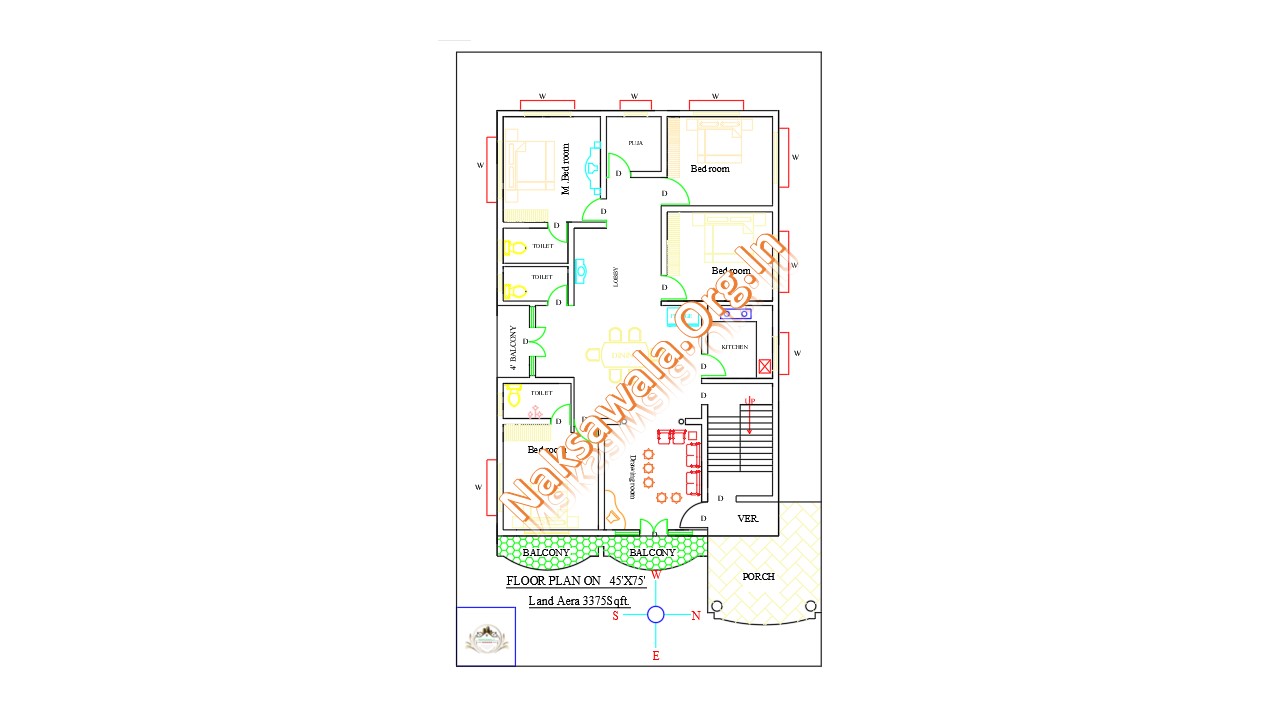We design for you a very beautiful duplex house in 45×75 plot size with land area 3375 sqft and builtup area 4200 sqft, in which two flats of 4bhk and guest room. If seen in this way, a total of 8 bed rooms, two guest rooms, two kitchens, 6 bath rooms and a hall ,puja room are also available, which is an eastern facing house design.