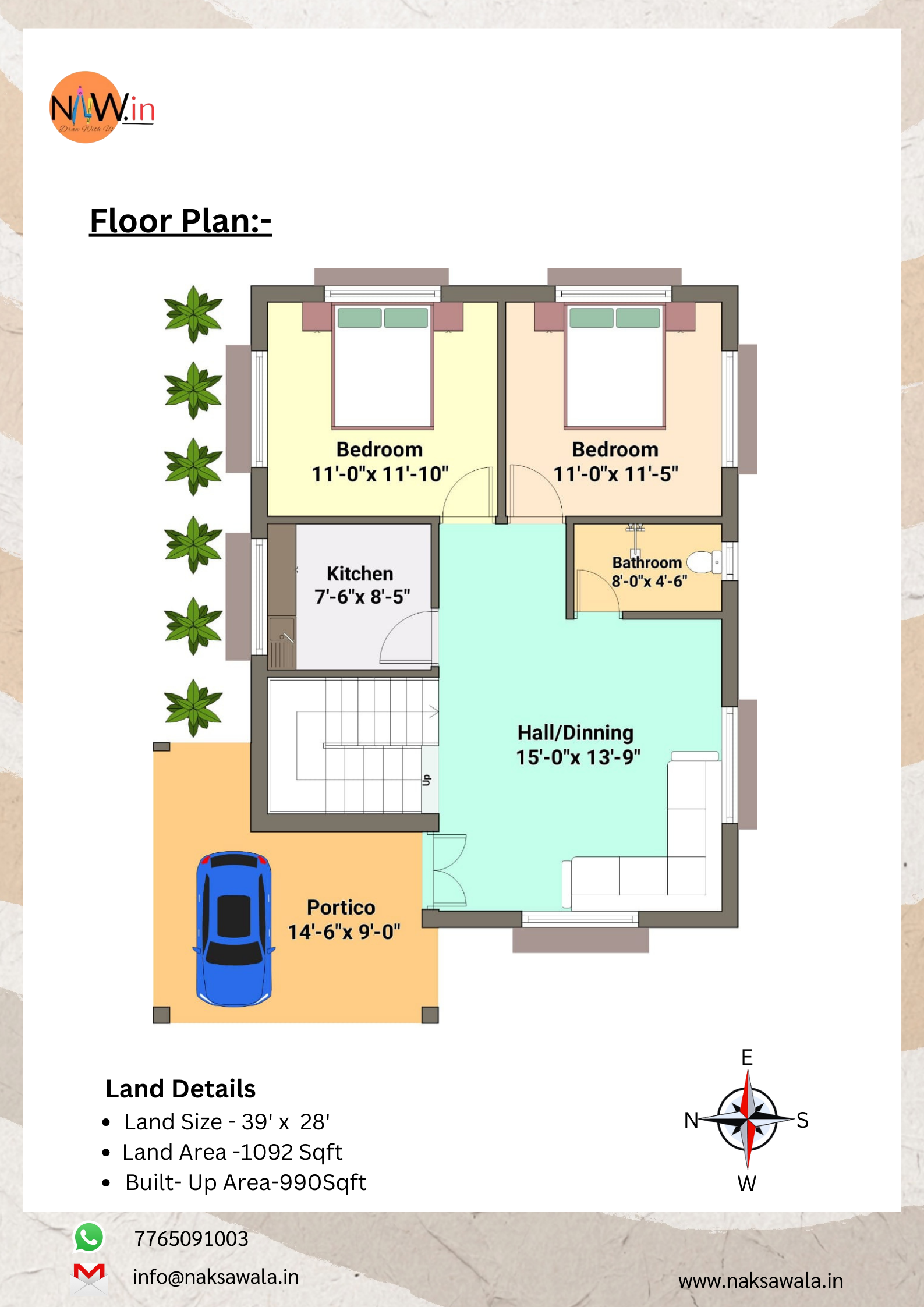990 Sq.ft Built-up | Spacious Hall Layout with Car Portico & Internal Staircase